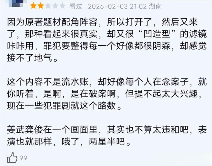 姜武作为老戏骨,演技是没问题的,但他全程一直戴着的墨镜,就实在碍眼了。