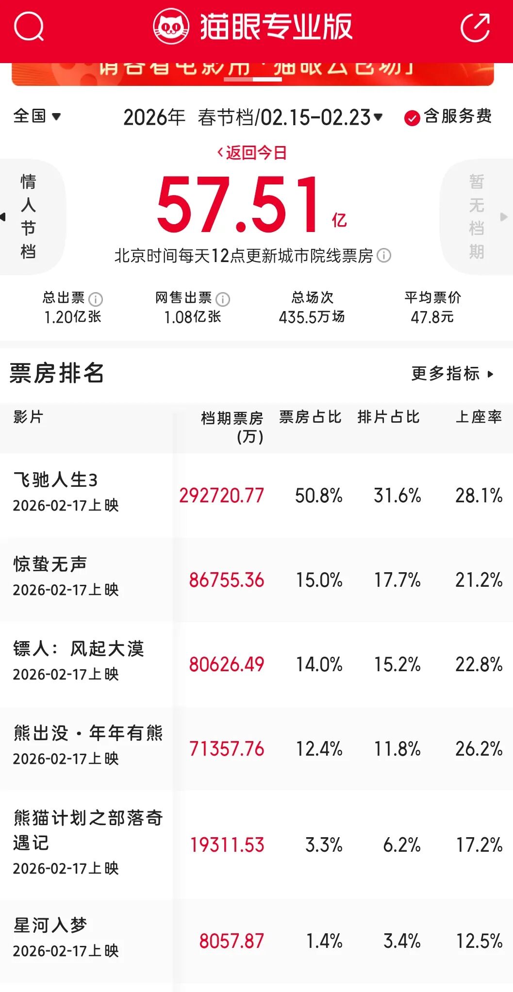 《飞驰人生3》一骑绝尘,假期内收获了近30亿元票房,且走势非常平稳,到大年初七单日票房都还保持在3亿以上。“但光靠《飞驰人生3》撑不起大盘,这样体量的电影起码还得有一两部。