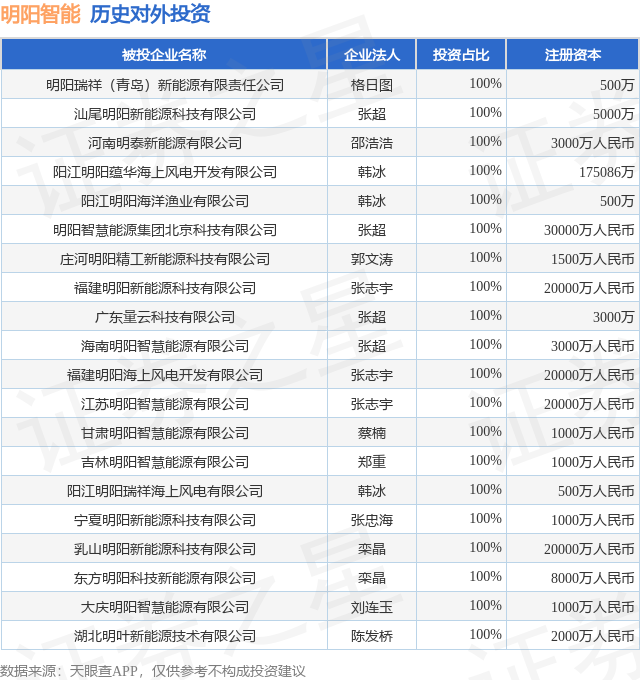本站消息,根据天眼查APP显示铁牛配资,明阳智能(601615.SH)新增一起对外投资事件铁牛配资,被投资公司为明阳瑞祥(青岛)新能源有限责任公司,法定代表人格日图,投资占比为100%。该公司从事电力、热力生产和供应业,注册资本为500万。目前,明阳智能共存在对外投资114项,投资占比前20的项目见下表: