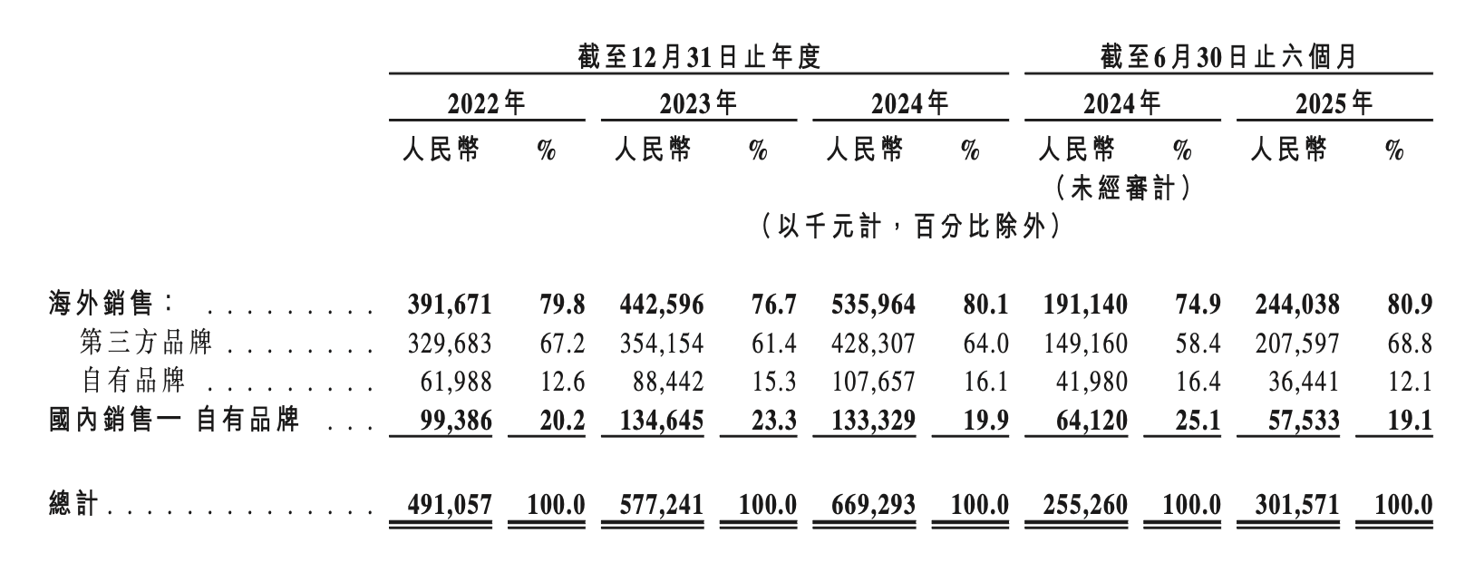 同一时期,公司国内销售收入(均属自有品牌销售)分别为0.99亿元、1.35亿元、1.33亿元及0.58亿元,分别占同期总收入的20.2%、23.3%、19.9%及19.1%。