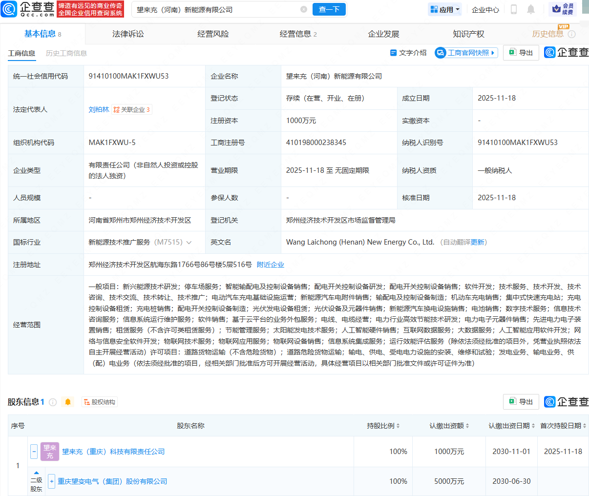近日,望来充(河南)新能源有限公司成立金财顺,法定代表人为刘柏林,注册资本为1000万元,经营范围包含:新兴能源技术研发;机动车充电销售;集中式快速充电站;充电桩销售;电池销售等。企查查股权穿透显示,该公司由望变电气(603191)间接全资持股。